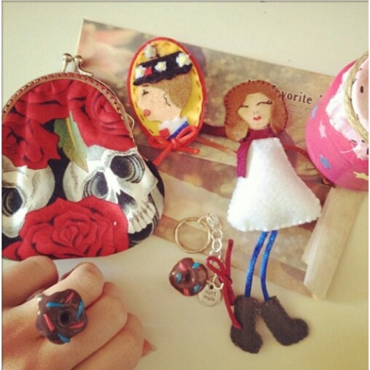 La hice una cartera de calaveras, un broche con una muñeca inspirado en la muñeca de su logo, un broche de Mary Poppins, y un anillo y llavero con forma de donuts, un bote con caramelitos y creo que no me dejo nada en el tintero.