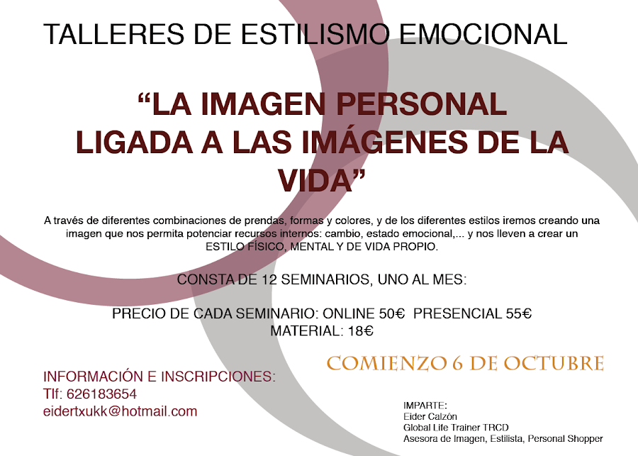TALLERES DE ESTILISMO EMOCIONAL TRCDLOS COMPLEMENTOSTALLER 1 LAS GAFAS VER BIEN LO QUE TE RODEA COMO CAMINO DE INTROSPECCIÓN PRESENCIAL Y ONLINE INFORMACIÓN E INSCRIPCIONESTlf: 626183654eidertxukk@hotmail.com IMPARTE: Eider CalzónGlobal Life Trainer TRCDAsesora de Imagen, Estilista, Personal Shopper
