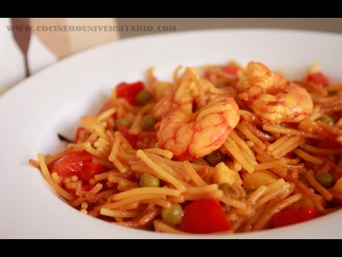 Ingredientes para 2 comensales1 TAZA DE FIDEOS MEDIANOS 1 TAZA DE CALDO 1/2 CALAMAR 6 COLAS DE GAMBONES 2 CUCHARADAS SOPERAS DE TOMATE FRITO 1 PUÑADO DE GUISANTES 1/2 PIMIENTO ROJO 1/2 VASO DE VINO BLANCO CURCUMA PARA DARLE COLOR 1 PIZCA DE PIMENTON DULCE ACEITE DE OLIVA SAL MIRA EL VIDEO PARA VER SU ELABORACION SON 2 MINUTOS