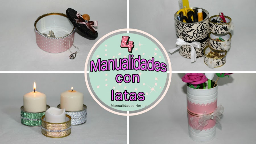 Hoy os muestro cuatro maneras diferentes de manualidades con latas. Un organizador de escritorio, un joyero, un jarrón y unos portavelas. Todo en un solo video. ¿ Me acompañas y te muestro cómo se hace ? Materiales Papel de regalo o papel estampado, latas, lazos Papel o cartulina, troqueladora ( opcional ) Silicona caliente y fría, pintura acrílica Strass adhesivo, lápiz, washi tape Goma Eva, una ...