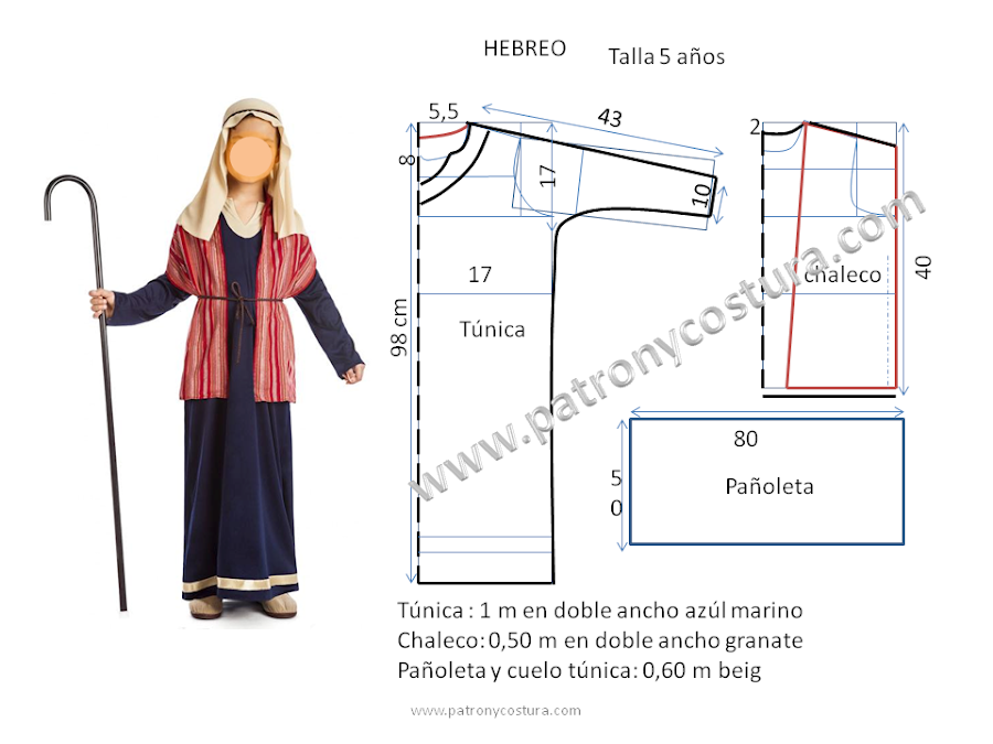 Patrón y costura, nos muetra cómo realizar el patrón para un disfraz de hebreo en talla 5 años. Se aproximan las fechas navideñas, muchas nos veremos en estos trabajos estos días para asistir a eventos organizados en colegios, ayuntamientos y parroquias. Aquí aporto mi granito de arena para ayudar y llevéis una idea. Tenemos en cuenta las medidas de la talla de la persona que lucirá el disfraz, ...