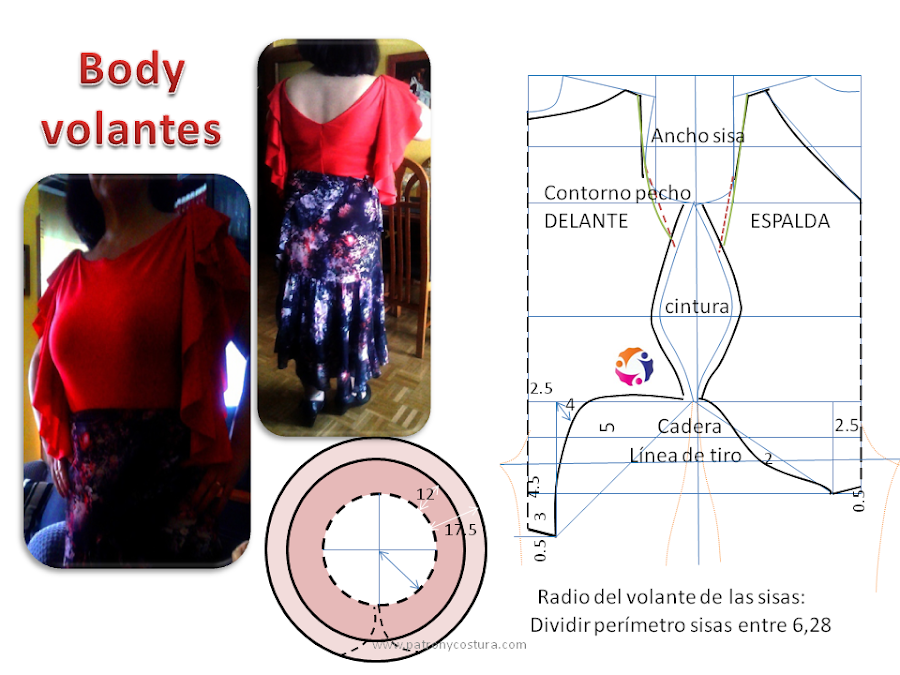 Patrón y costura nos muestra cómo realizar patrón, corte y confección de un alegre body con volantes alrededor de las sisas. MATERIAL Necesitamos 2 metros en doble ancho (1,60 m) en tela de licra, hilo del color. CORTE Y CONFECCIÓN Realizamos el patrón base (Ver tema), con nuestras medidas y tenemos en cuenta la elasticidad de la tela, por tanto, restamos al contorno de nuestra medida un 10% ó 1 ...