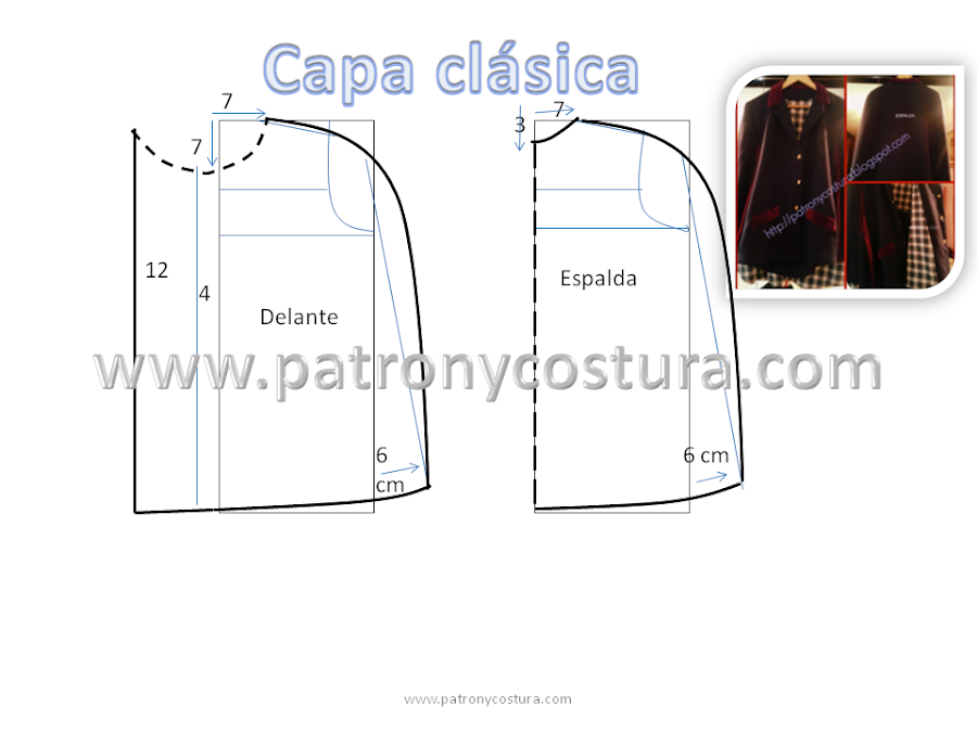patrón y costura: vamos a hacer la capa clásica. Actualmente de moda, tanto la clásica como la española. Vamos a ver las diferencias de una capa de con otra. Se necesita (dos largos) de género de abrigo, forro, entretela , hilo y botones. Hacemos el patrón base y lo alargamos hasta el largo de la capa, en la bajada de hombro le damos 3 cm y en el escote de delante 7 x 7 cm, además de 12 + 4 cm ...