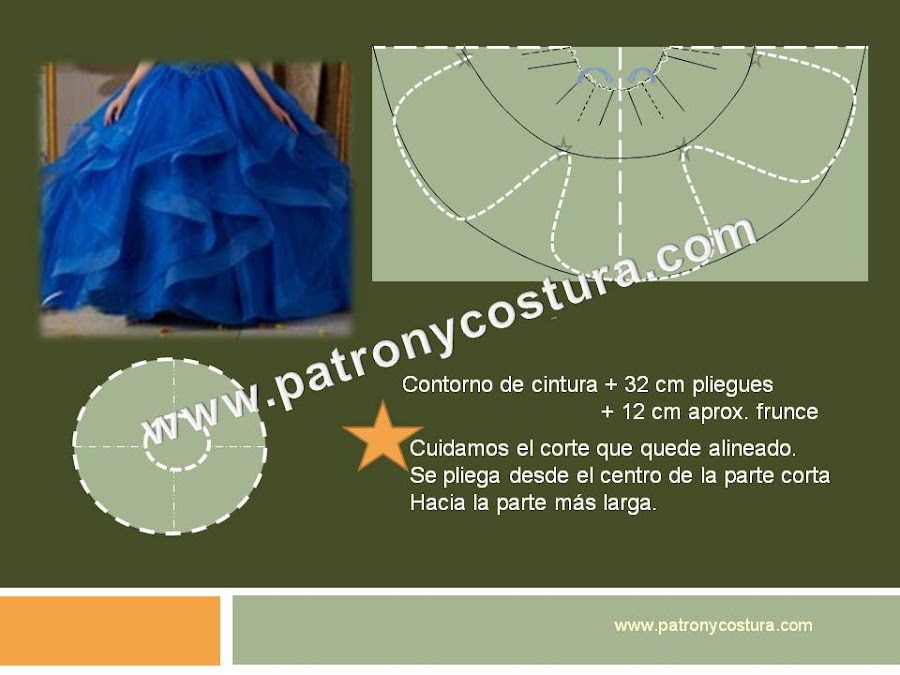 Patrón y costura nos muestra cómo realizar una falda de capa larga asimétrica con pliegues y frunce. Os muestra imagen referencia: 1. Medimos el contorno de la cintura y el largo. 2. Sumamos al contorno de la cintura los centímetros de los pliegues y el frunce. 3. Hallamos el radio con la suma total del contorno con los centímetros extra. Dividimos esa cantidad entre 6, 28 y el resultado es el r ...