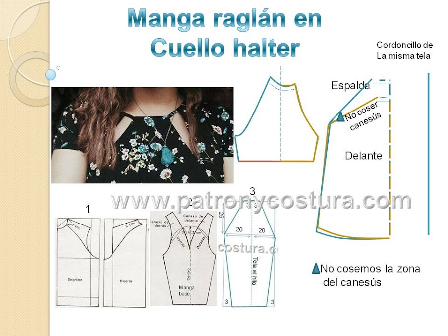 Patrón y costura nos muestra cómo realizar el patrón de la manga raglán sobre escote cuello halter manga raglán en cuello halter 1. Realizamos los patrones base del cuerpo delante y detrás, también de la manga base. 2. Dibujamos los canesús según imagen 1, recortamos y engomamos o pegamos a la manga base, formando la manga raglán. 3. Unimos ambas piezas del canesú formando una sola pieza, corta ...