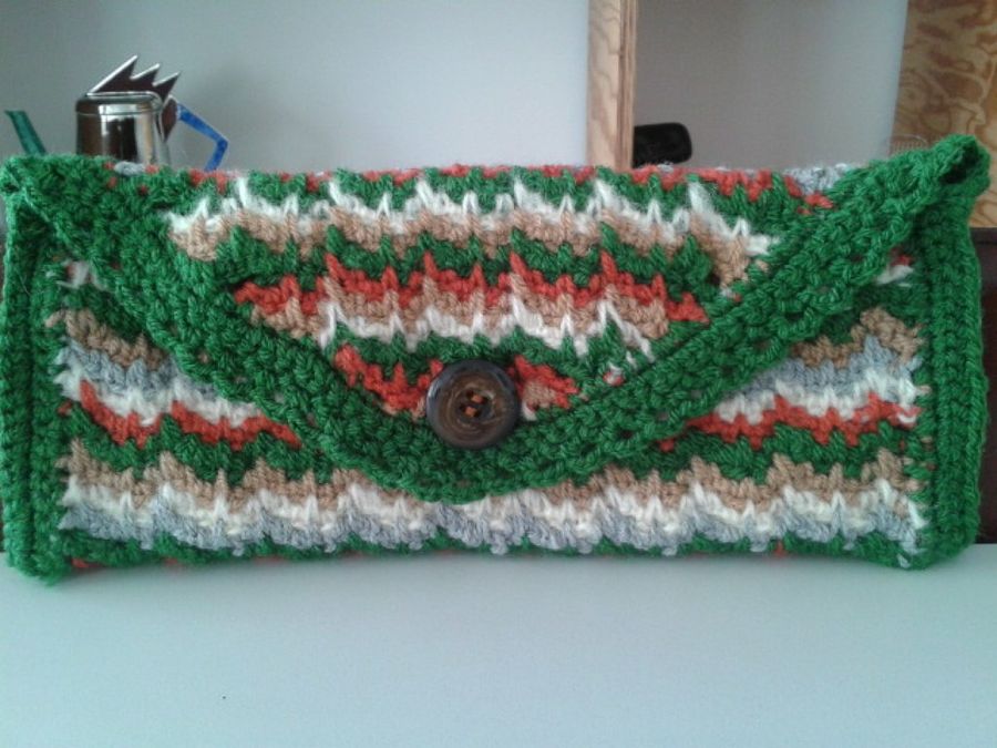 Una carterita hecha con restos de lana, según tus necesidades y las lanas de que dispongas más grande o más pequeña. http://jubilocios.blogspot.com.es/2013/11/carterita-con-restos-lanas.html