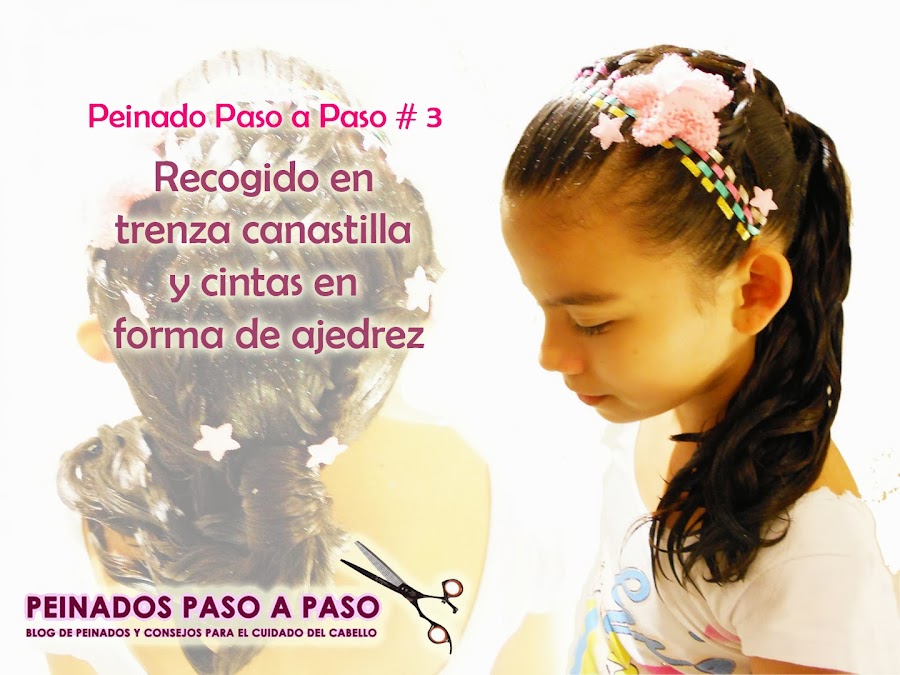 En esta ocasión vamos a realizar un peinado recogido en trenza canastilla adornado con cintas en forma de ajedrez con apliques ideal para fiestas y para que tu princesa se vea espectacular. Paso # 1 Realiza una división por la mitad del cabello de manera vertical hasta la mitad de la cabeza y a su vez realiza otra división de manera horizontal hasta detrás de las orejas. Y con el cabello sobrante ...