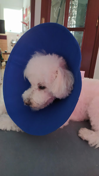 Hoy Coco siegue estando precioso con su campana azul para que no se lama la herida.