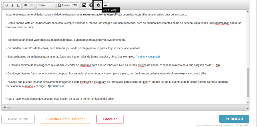 - Como habrás visto en las bases del concurso, siempre pedimos al menos una imagen por idea publicada, pero se pueden incluir tantas como se deseen. Aquí tienes unos pantallazos donde se muestra cómo se hace.