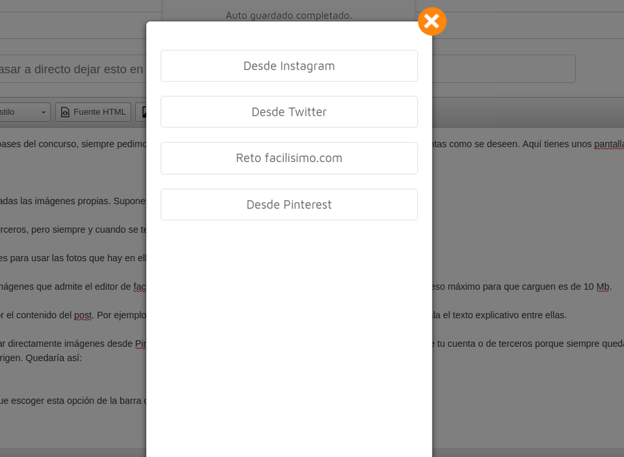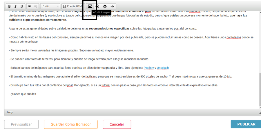 - El tamaño mínimo de las imágenes que admite el editor de facilisimo para que se muestren bien es de 900 píxeles de ancho. Y el peso máximo para que carguen es de 10 Mb.