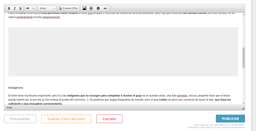 El texto tiene muchísima importante, pero la o las imágenes que se escogen para completar e ilustrar el post no se quedan atrás. Una foto pixelada, oscura, pequeña, hace que el lector pierda interés por lo que lee (y eso incluye al jurado del concurso...). No pedimos que hagas fotografías de estudio, pero sí que cuides un poco ese momento de hacer la foto, que haya luz suficiente o que encuadres correctamente.A parte de estas generalidades sobre calidad, te dejamos unas recomendaciones específicas sobre las fotografías a usar en los post del concurso:
