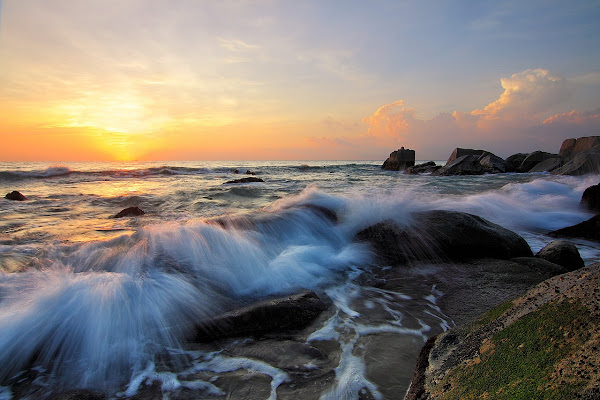 Escucho el romper de las olas en las rocas, y vuelvo a cerrar los ojos para sentir otra vez ese olor y recibir en mi rostro la gran cantidad de pequeñas gotitas de agua y espuma salpicada, movidas por el viento. Veo los picos de espuma blanca de las olas y puedo casi hacer real aquella situación que tantas veces se dió en mi infancia: A un lado mi padre con su caña, yo con la mía y mi hermano pequeño con la suya. Eran cañas naturales en varias piezas y que había que montar para poder usar, con sedal, anzuelo y un corcho pintado de rojo en su mitad superior. También puedo recordar los cebos, unas lombrices de tierra metidas en serrín y que vendían en unas pequeñas cajas cuadradas. Recuerdo lanzar mi caña con el anzuelo y esperar ... Notar en la caña los pequeños tirones de los peces mordiendo el cebo, hasta que por fín, en uno de esos tirones, veía doblarse casi en forma de herradura el extremo de la caña y hundirse aquel corcho rojo durante 3-4 segundos ¡¡era el momento de tirar!! Hacerlo con fuerza y ver salir el pez con el anzuelo mordido. Cada vez que cogíamos uno, lo lanzábamos a un hueco grande socavado en la roca donde nos encontrábamos, y que estaba lleno de agua de mar de la marea de la noche anterior. Ahí, en ese diminuto "mar", es donde pescaba mi hermano pequeño con su minúscula caña ... No puedo evitar sonreir recordando aquello, y cómo mi hermano decía ¡pican, pican! mientras ponía su anzuelo con cebo en aquel gran charco salado e intentaba pescar de nuestra pesca ...
