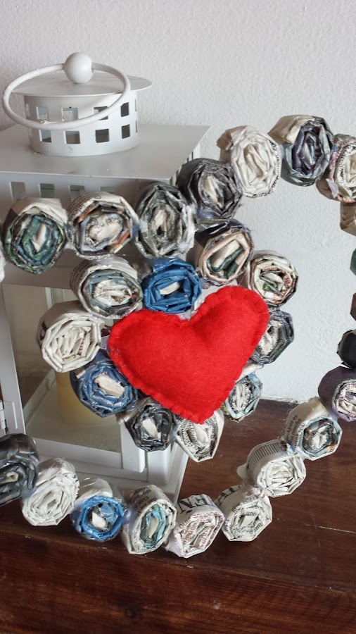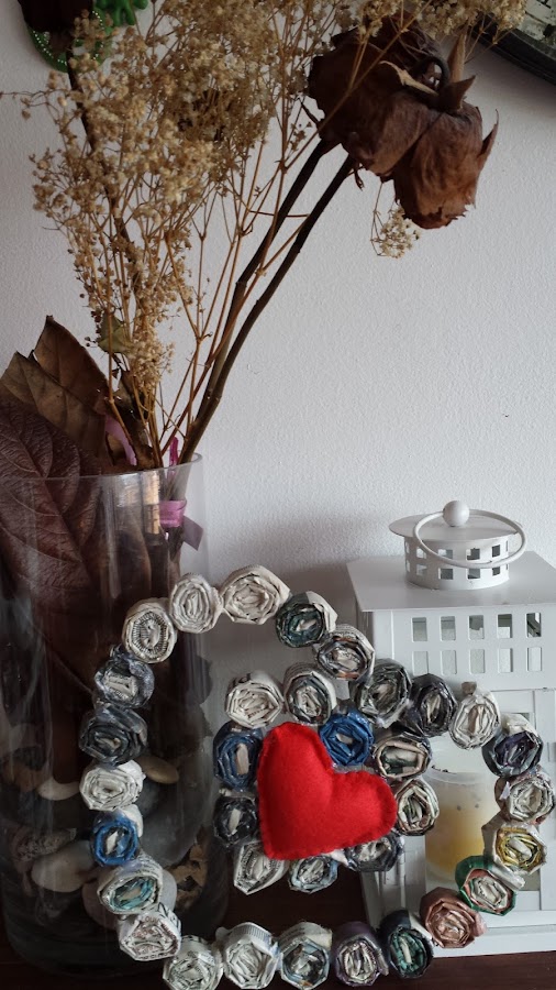Cuando he tenido unos cuantos he ido uniendo todo y haciendo la forma, después para endurecerlo un poco le he dado algunas manos de cola mezclada con agua, y cuando ha estado bien seco le he aplicado un barniz de brillo.