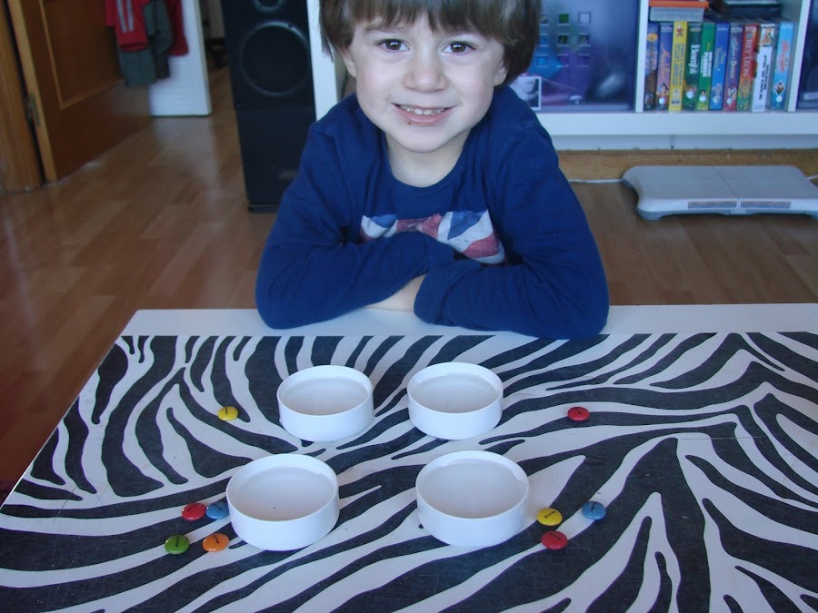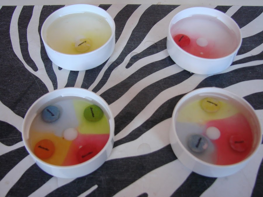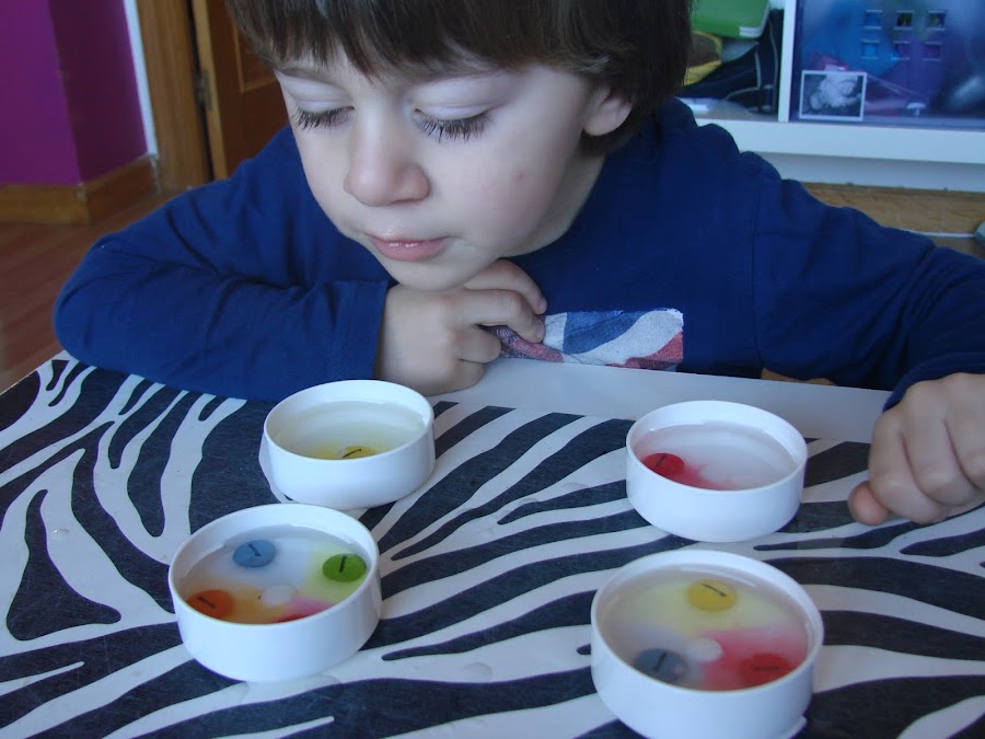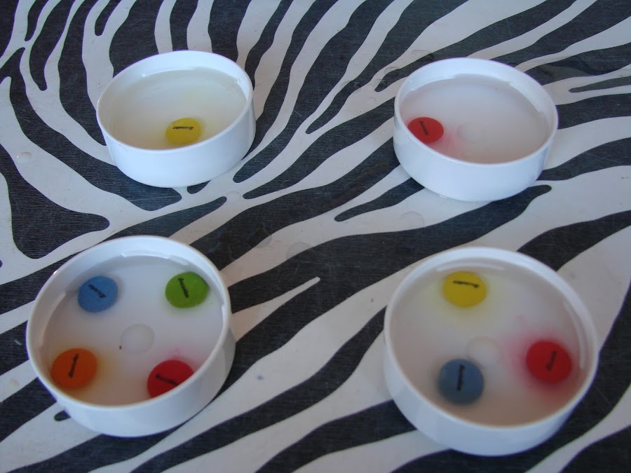 Ponemos en cada tapa agua y echamos los lacasitos, en el experimento te ponen dos tapas pero el enano quiso poner dos con uno , en otra tapa pusimos tres y en otra cuatro....