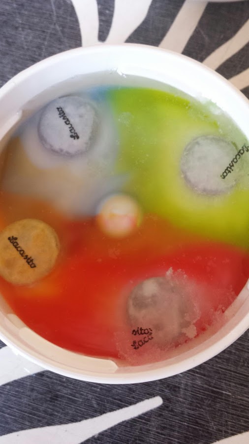 Y simplemente nos ponemos a observar, poco a poco vemos como la capa del color se va disolviendo en el caso de las tapas que tienen solo un lacasito el color se va hacia los bordes, en el caso de las tapas con mas lacasitos también observamos que el color se disuelve alejándose del centro del lacasito, pero los colores nos se mezclan , si no que forman una frontera, y eso es por la densidad del azúcar.