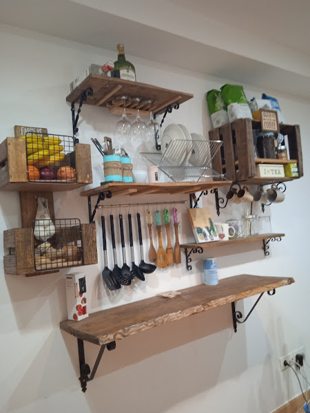 Así ha quedado mi cocina, está todo hecho con materiales reciclados. El color del barniz es el nogal, no usé brocha, usé un trapo de algodón para qué secará más rápido y no perder los dibujos de la madera.