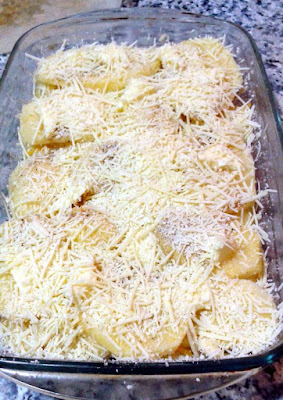 Para acompañar este riquísimo plato de pez espada hice un gratín de patatas. Es muy sencillo de hacer y rápido y sirve para acompañar a pescados y a carnes. Así fue como lo preparé, alternando capas de patatas. INGREDIENTES: 1 kg de patatas ½ diente de ajo 4 cucharadita de mantequilla 1 cucharadita de sal Pimienta 1 taza de gruyere (115 gr.) o emental rallado. 1 taza de leche hirv ...