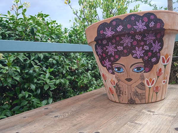 Hoy os quiero mostrar cómo ha quedado mi último trabajo con macetas de barro pintadas a mano con pintura acrílica.Para mí está maceta a sido especial, me la encargaron unos amigos y la temática iba a cuenta mía. No tenía un concepto en concreto así iba dibujando y pintando dejaba que mi imaginación hiciese su trabajo.