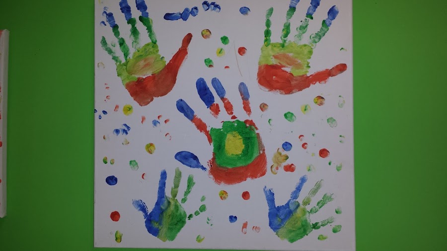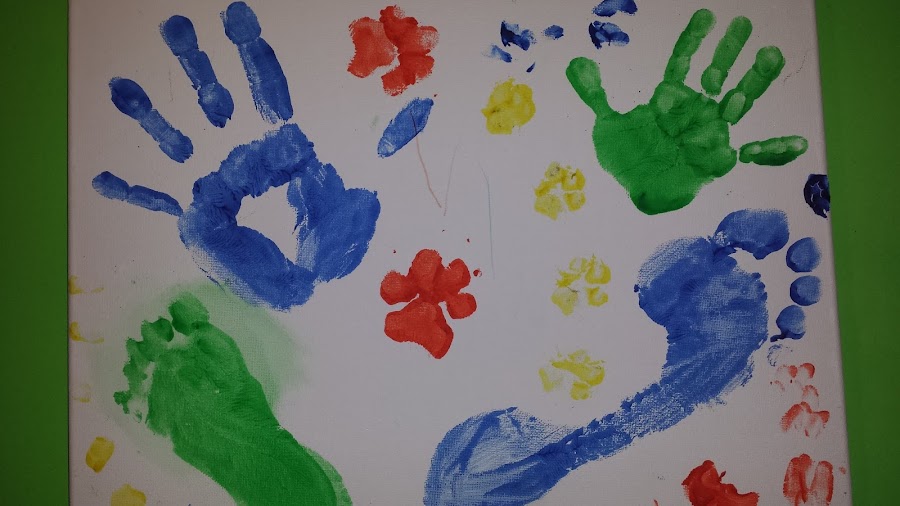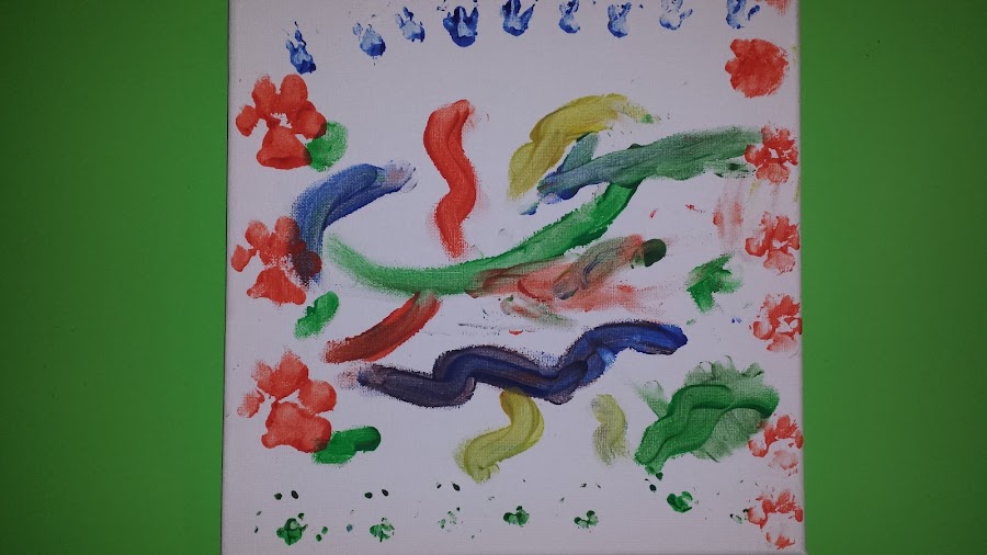 Compre unos lienzos no muy grandes y deje que el enano sacara su vena artisticapicassiana, y que improvisara en uno de los lienzos y después para los otros dos decidimos hacer cuadros de manos y pies, tanto los nuestros como los de las mascotas, tortuga ,perro, gato y cobaya incluidos, aquí firmamos todos, incluido el papi que no nos acompaña en esto de las manualidades, si no es de construir no le convencemos .