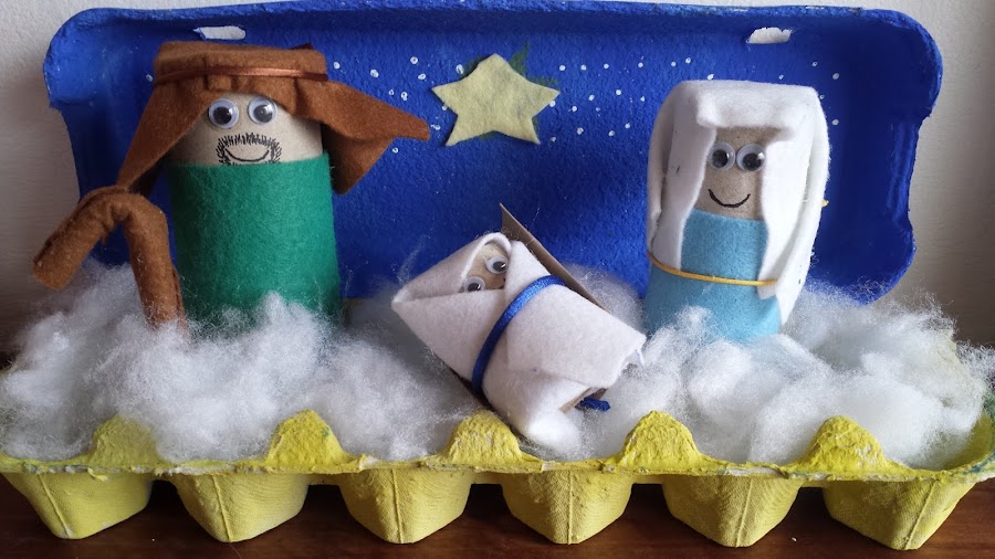 Con los rollos de papel hicimos a la Virgen, San José, el niño y la cuna, les forramos de fieltro y les pegamos unos ojos...