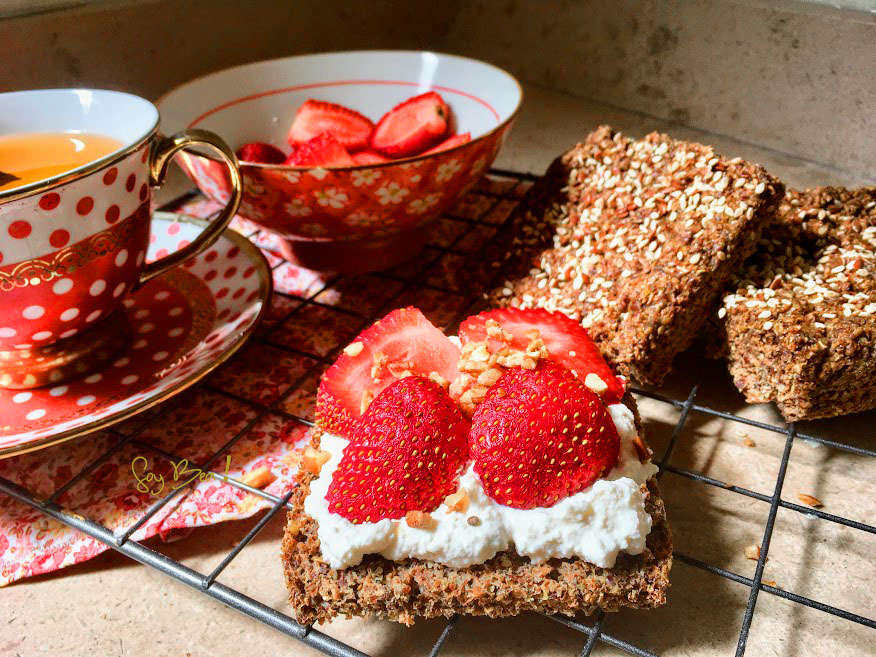La segunda propuesta para una semana muy fresa Pan de linaza, sin azúcar, sin levadura, sin harina Tengo que confesar que este pan me acompaño toda mi dieta y aun cuando ya podía comer pan integral preferí seguí comiéndolo. Su sabor es un tanto fuerte por lo que recomienda preparar con linaza dorada que no es tan amarga En la foto se los muestro en un desayuno con queso ricota, fresa y nueces, ...