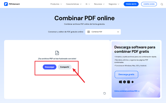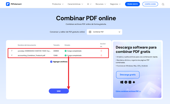5. Combina los PDFs. Una vez que estén en el orden que quieres, haz clic en el botón ‘Unir’. PDFelement Online procesará los archivos y los unirá en un solo PDF.
