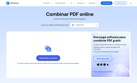 Ahora que ya tienes una idea de cómo funcionan las herramientas para trabajar con documentos PDF online, vamos a ver un ejemplo práctico. Imaginemos que tienes un informe empresarial ya hecho en formato PDF, pero debes añadirle un par de páginas con datos que acaba de llegar a tu correo electrónico. Puedes hacer esto con la herramienta de unir PDF en la versión web de PDFelement.El proceso es el siguiente: